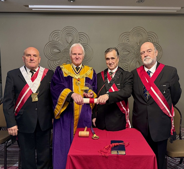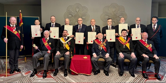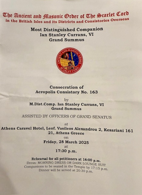 It was a bumper day in Athens as the Scarlet Cord Grand Team performed a Preparation Ceremony for 9 Companions followed by the Consecration of the newest Consistory in the Order ‘The Acropolis Consistory No. 163’. A wonderful Oration was given by R.Dist.Comp. Charles Aspinal covering the aspects of the Order and the background to the name of the New Consistory in particular.