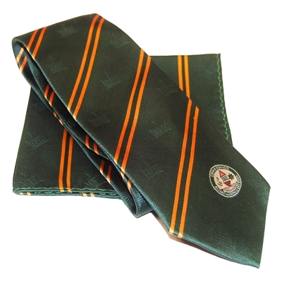 Description: Tie and Handkerchief set of Green with Gold Stripes Silk, featuring the Allied Masonic Degrees Logo and Gridirons woven throughout. This is the official Tie & Handkerchief of the Order