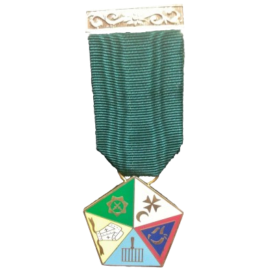 Description: Allied Masonic Degrees Composite Breast Jewel featuring a pentagonal pendant adorned with the symbols of the five degrees of the Allied Masonic Degrees. Worn by a member when all five degrees have been taken.