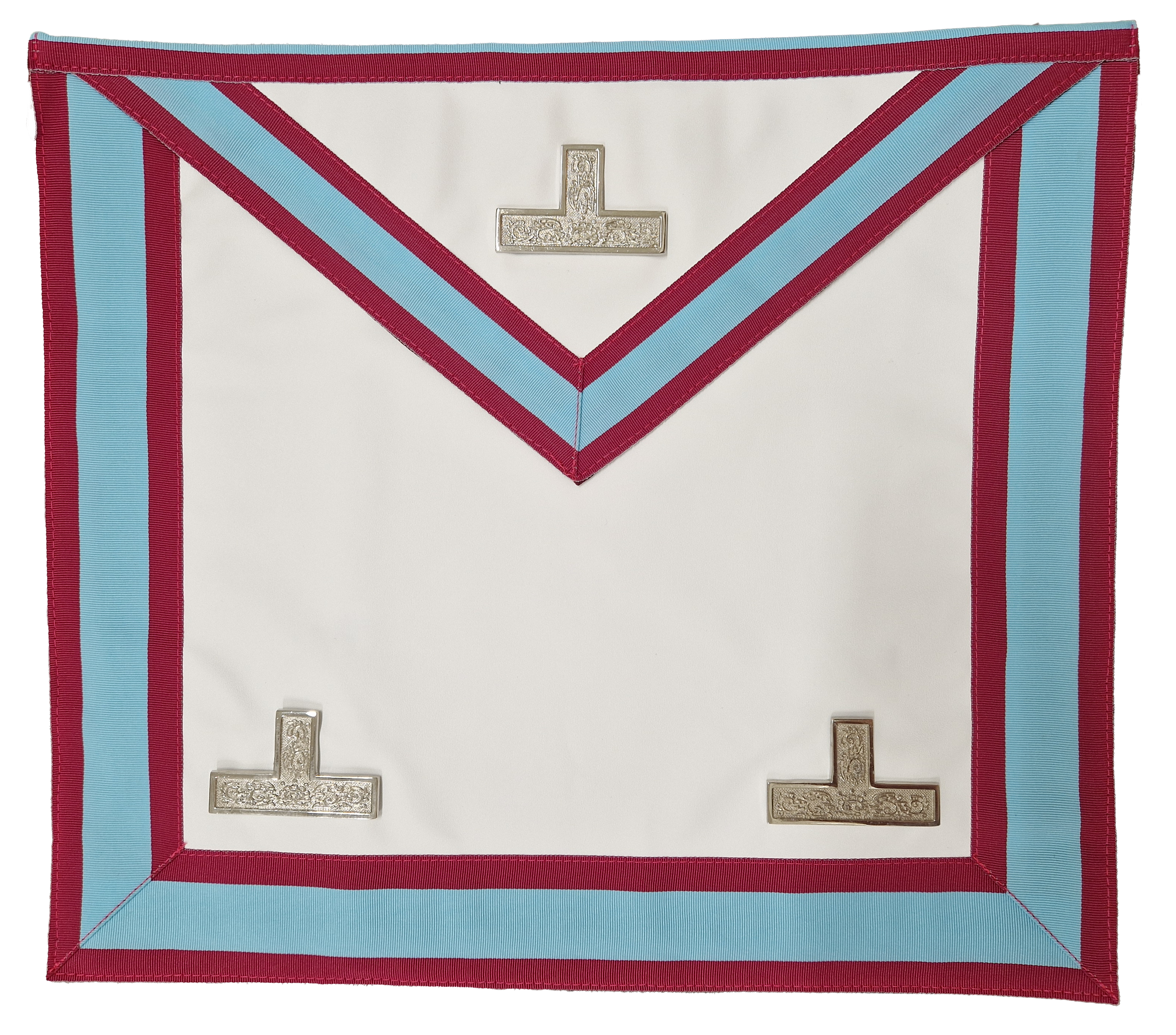 Description: Mark Worshipful Master Apron, imitation leather, silver plated levels, edged with ribbon two inches wide in the Mark colours of light blue and crimson. Finished with a crimson lining and a pocket in the back.