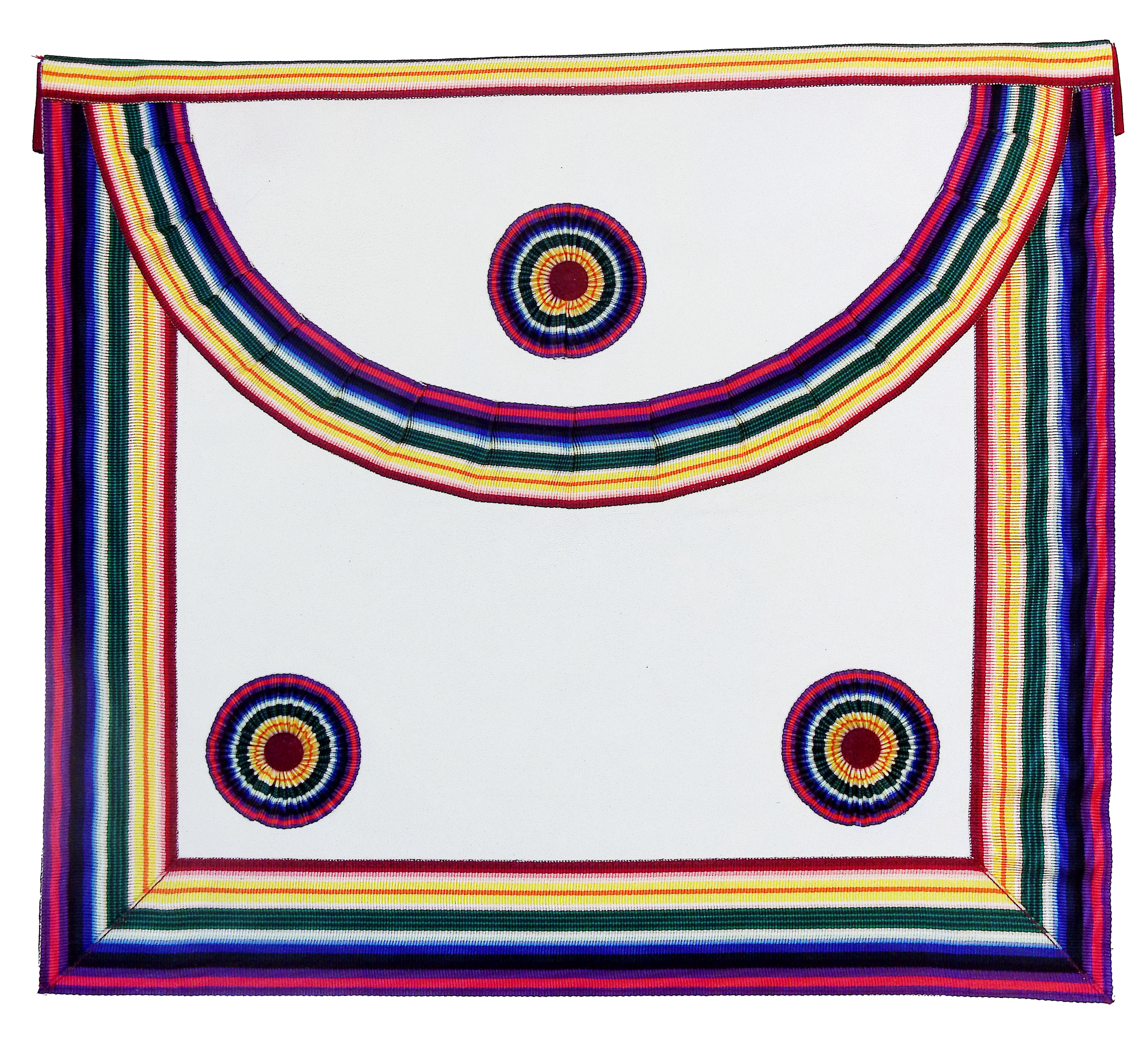 Description: Royal Ark Mariner Member’s Apron made in imitation leather, edged with 2 inch rainbow ribbon and finished with rosettes.