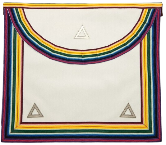 Description: Royal Ark Mariner Commander’s Apron, made from high-quality leather, embellished with vibrant rainbow ribbon. Finished with polished silver-coloured metal triangles.