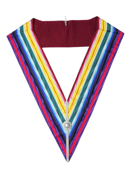 Description: Royal Ark Mariner Officer’s Collar. This high-quality collar features a 4-inch wide Rainbow ribbon, accentuated with silver-coloured cord and a button.