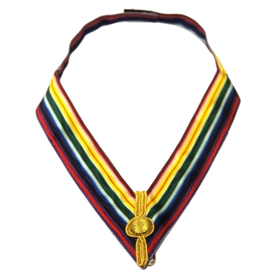 Description: Royal Ark Mariner Grand Rank Collarette, 1 ¼ inch Rainbow ribbon, enhanced by a gold-coloured braid, and finished with a gold-coloured button.